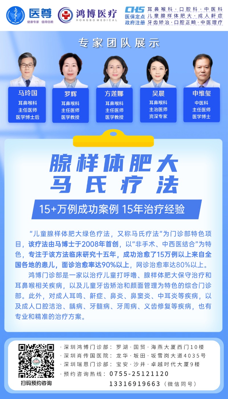 【特色疗法】“儿童腺样体肥大绿色疗法”又称马氏疗法,该疗法由马博士于2008年首创,以“非手术、中西医结合”为特色,专注于该方法临床研究,截至2025 年 7 月,累计线下和线上接诊患者约20 万人次。特邀深圳市人民医院耳鼻喉科医学顾问马博士,特邀原深圳市儿童医院口腔正畸科主任,口腔正畸/张口呼吸/肌训练专家林琳主任前来坐诊,预约耳鼻喉可免费享受一次专家口呼吸深度咨询,特邀师从首都儿科专家,独创“肾脾双调培元促长体系”邱丽漪教授,多家三甲医院工作学习经验的中医硕士林子茵医生,擅长儿科综合诊治,脾胃调理,体质辩证,骨龄检测,生长发育迟缓的综合治疗,尤其推拿按摩手法独到,精准施治,欢迎预约。 |